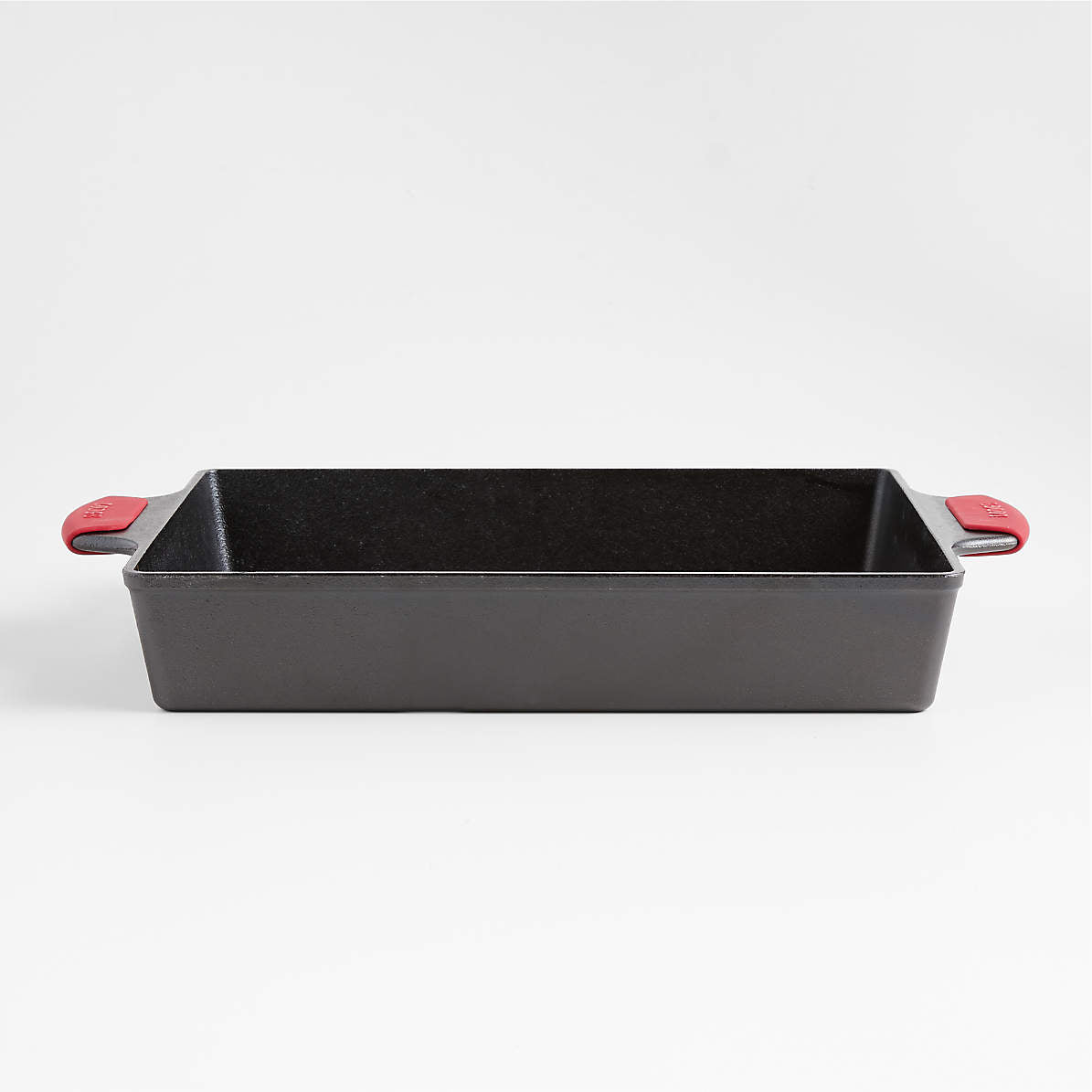 Lodge's long-revered cast iron shapes a pan designed especially for baking, crafted with crisp edges, high walls and modern details. Retaining and distributing heat evenly, the sturdy cast iron will not dent, bend or warp while baking lasagna, farro casserole or cherry cobbler for a crowd. The pan is pre-seasoned and ready to use and features snap-on red silicone handles that provide easy lifting and a comfortable grip.