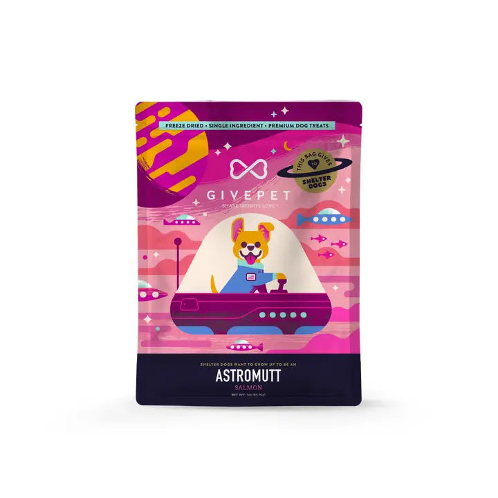 A 3oz bag of freeze-dried dog treats with one ingredient - wild-caught salmon! If it's good enough for astronauts, it's good enough for your best friend! Perfect for training or treating, pups love these singe ingredient treats. The treats do not contain any artificial colors or flavors and are good for food sensitivities due to their limited ingredient panel.