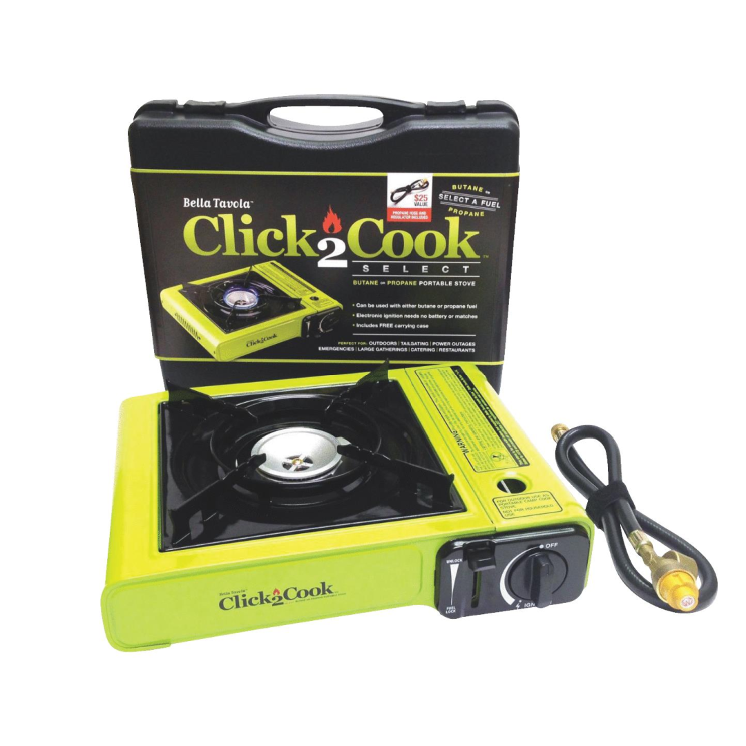Bella Tavola BT-4500 Click2Cook Butane/Propane Portable Stove. The Bella Tavola BT-4500 Click2Cook select a fuel butane or propane portable stove is ideal for restaurants, catering, cooking outdoors, tableside preparations, parties, weddings, tailgating and camping. It features an easy to use piezo ignition system and cast aluminum burner. It uses Bu-Tank notched collar fuel cartridge or includes a propane regulator and hose assembly to connect to 1lb propane cylinders. The stove adjusts from simmer to boil, and it includes a gas leak prevention device and pressure sensing safety shut off device. The stove comes in a plastic carry/storage case with a handle.