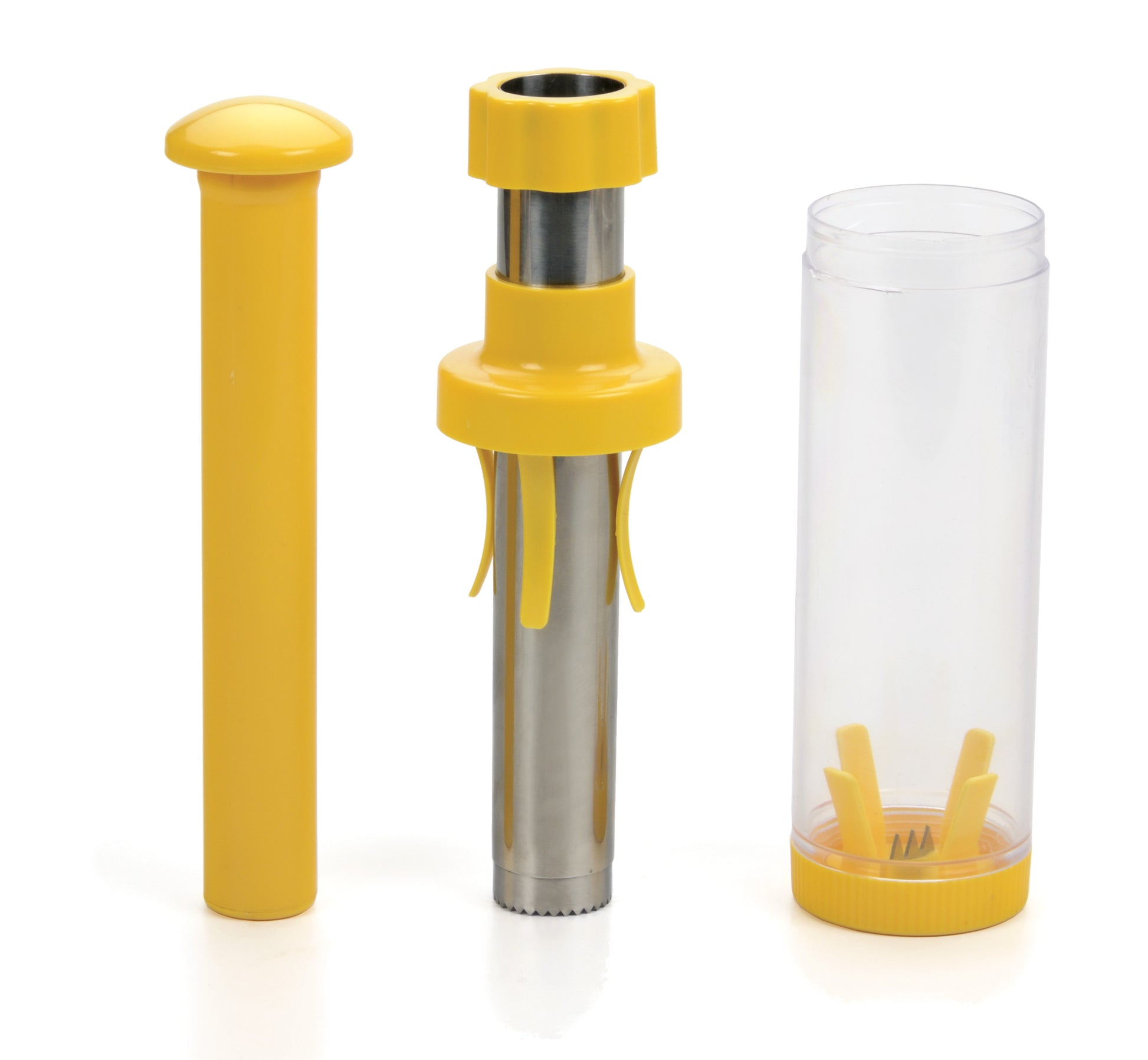 Our Patented Deluxe Corn Stripper makes quick (and clean) work of removing kernels from the corn cob! Best of all, when the corn kernels are stripped from the cob, they are contained inside the corn stripper’s cylinder, eliminating wayward kernels and corn juice splatters. Remove corn kernels from fresh, frozen (defrost first) or cooked corn on the cob to prepare nutritious and delicious chowder, soup, or side dishes (we highly recommend this amazing Grilled Corn and Jalapeno Dip). Constructed from durable plastic with an 18/8 stainless steel blade, our corn stripper has an overall size of 2-3/4″ dia. x 10-1/2″ tall. All parts are dishwasher safe.