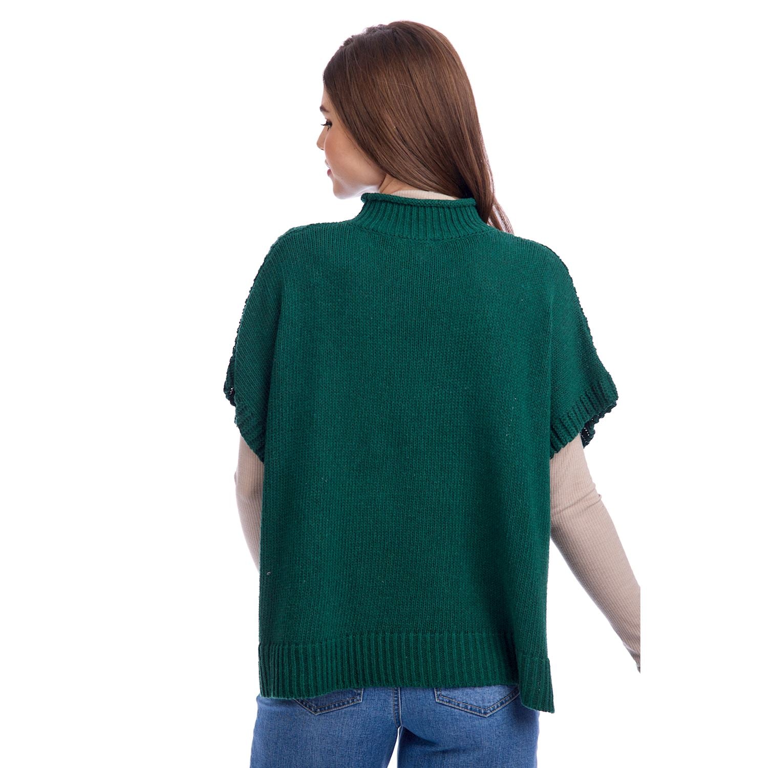 Polyester knit sweater features rolled mock neck, ribbed sleeve openings and side slit hem. One size fits most. Measures approximately 22" from shoulder to hem.
