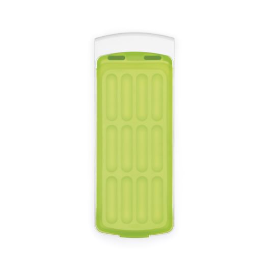 Regular ice cubes won't fit through openings in most water bottles, but narrower ice sticks are shaped to slide through tight spaces. After filling Tray, cover with the silicone lid to seal in water and keep out odors. When lid is sealed, Tray can be stacked or stored at any angle in the freezer.