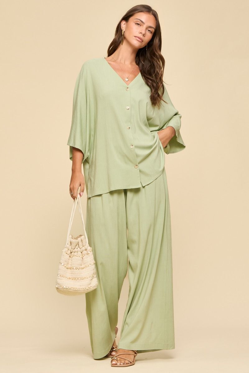 This beautiful linen set is perfect for your get away vacation! We love the button details on front with elastic pants! It's chic, fashionable, and easy to wear! Non sheer, woven.