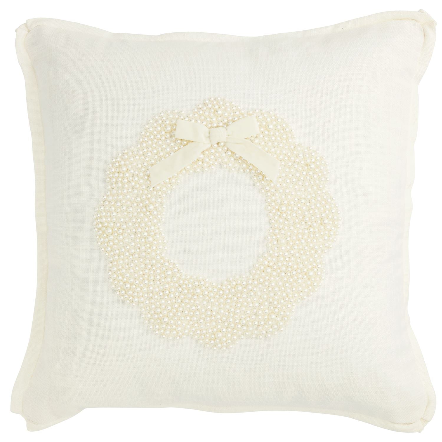 Cotton pillow features pearl bead applique with velvet bow and self flange edge. Zipper closure.